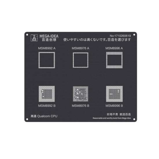 MEGA- IDEA Black Stencils QUALCOMM CPU MSM8992 A B | MSM8976 A B | MDM8996 A B – is born for rebelling tin balls, bring you unique using experience, making every tin ball round and full. Professional builder of black rebelling stencils. great ordinarily. economic but functional. With multiple polish and test, all series of rebelling tools for apple and android phone chips finally come out.