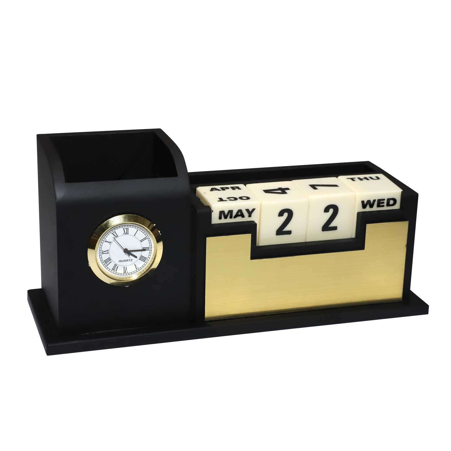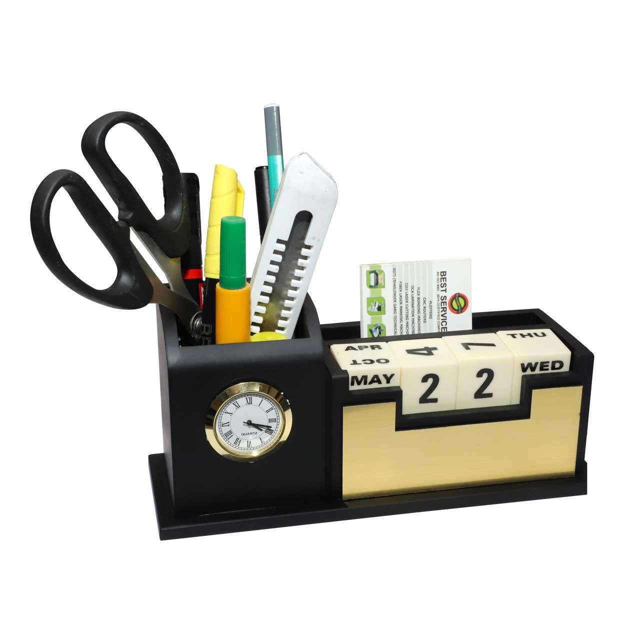 Enhance your workspace with this elegant wooden pen stand, featuring an integrated clock and calendar. Crafted from high-quality wood, this versatile desk accessory keeps your pens organized while providing easy access to the time and date. Perfect for maintaining a tidy and efficient workspace, it combines functionality with sophisticated design, making it a stylish addition to any office or study.